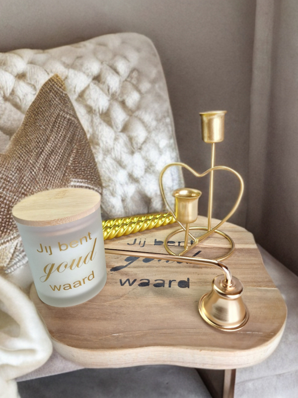 OverzichtGeschenkset Jij bent goud waard omvat een houten decoratieplaat met eigenhandig ingebrande tekst, een witte geurkaars met deksel en tekst, een kandelaar in de vorm van een hart met 2 kaarsenhouders in goud, een kaarsendover in goud en 2 gouden spiraalkaarsen