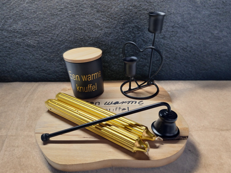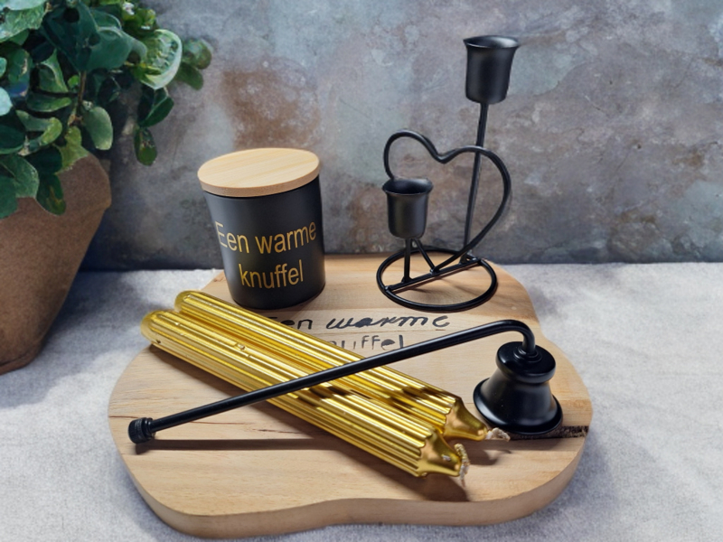 Houten decoratie bord met ingebrande tekst, kaarsenhouder in de vorm van een hart en in goud voor 2 kaarsen, kaarsendover in goud, geurkaars met deksel in wit mat met tekst en 2 gouden spiraal kaarsen